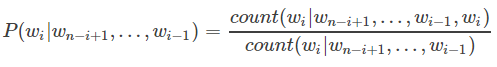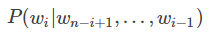 wi为语言模型要预测的目标词,序列wn−i+1,...,wi−1为模型的输入,即上下文,输出则为目标词wi的分布。用频率估计估计n元条件概率: