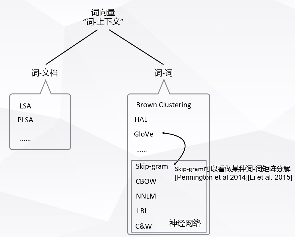 常见到的Global Vector 模型(GloVe模型)是一种对“词-词”矩阵进行分解从而得到词表示的方法,属于基于矩阵的分布表示。